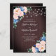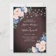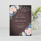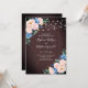Estes convites para o casamento apresentam um design floral de aquarela com flores cor-de-rosa azuis e pinceladas, folhagem de eucalipto e luzes de cordas sobre fundo de grãos de madeira. Personalize o texto do convite com o seu próprio texto. Produtos correspondentes também disponíveis. Por favor, visite nossa loja.
