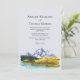 This wedding invitation features a breathtaking watercolor landscape of snow-capped mountains rising above golden fields of wild reeds and deep green forests. A soft blue sky and gentle birds in flight complete the scene, creating a feeling of timeless beauty and serene romance.