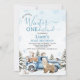 Winter themed first birthday invitation for a baby boy featuring a a bear, blue truck, pine forest, snow and a few other woodland animals. This winter onederland is ideal for a boy's winter first birthday party.