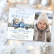 Cute winter onederland themed first birthday invitation with a photo featuring a blue truck and pine-tree forest and woodland animals.