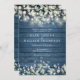 Um convite de casamento na moda rústico com luzes bonito de cordas e folhas de sage e lilac que caem sobre um pano de fundo azul de madeira rústica com seus detalhes de casamento definidos em texto elegante clássico. Projetado por Thisnotme©