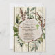 Uma fatia rústica de madeira com verde e penas ao redor das bordas deste Primeiro Convite da Santa Comunhão. Personalize facilmente com as informações da sua parte.