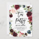 Celebrar com este convite de festas de chá rústico do país. Apresenta ilustrações de cor d'água de burgundy, blush e fundo azul floral. Este convite de festas de chá floral é perfeito para os eventos do outono e do tema "boho". A parte de trás do convite tem um fundo burguês com uma terra floral.
