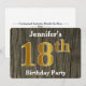 Este design de convite apresenta o número normal "18º" com uma aparência falsa em forma de ouro. Ele também apresenta um nome personalizado, e um fundo de aparência rústica de madeira falsa. Os detalhes do evento no verso podem ser personalizados. Poderia ser usado para convidar pessoas para a décima oitava festa de aniversário de alguém. [~Z0000016]