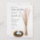 Convide convidados para uma festa honrando a mãe para estar com o encantador convite para Chá de fraldas de Ovos Azuis. Este chá temático, costume de chic, ao ar livre, apresenta uma fotografia natural de um ninho de pássaros de madeira cheio de ovos vermelhos salpicados e de uma garrafa de leite de vidro vintage com galhos salgados e cetim branco. Perfeito para um tema de evento natural de março, abril ou maio de primavera.