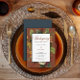 Um buquê floral etéreo em tons de branco de inverno, ouro, laranja e vermelho escuro com verde em um painel branco, de ouro duvidoso e escuro sobre um fundo laranja enferrujado convida seus convidados para o que é certamente um Janto rústico memorável de "Ação de Graças" elegante. O fundo apresenta um fundo negro de fundo lacrimejo. Design composto por Holiday Hearts Design (direitos reservados).
