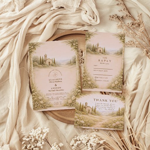A soft countryside garden scene featuring a romantic stone chapel, cypress trees, and gentle rolling hills framed by lush florals and greenery. The muted neutral palette and classic European-inspired landscape create a timeless, elegant look perfect for couples planning an outdoor or countryside celebration. This design blends rustic charm with refined details for a warm, romantic atmosphere that feels both intimate and enduring.