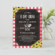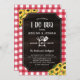 Gingham vermelho russo Eu faço o convite para o chá do CHURRASCO com grãos de madeira impressos, girassóis amarelos, utensílios de grelhador cruzados e um anel de diamante armando a data do chá do seu casal do quintal.