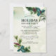 Escolha elegante e chic para uma festa de janto de férias apresenta arranjos holly e evergreen sobre uma lavagem de aquarela macia. Pinhas e bagas acrescentam a torcida de férias. A parte do janto Feriado é gravada em uma combinação de fontes grandes. Os detalhes do janto são escritos em um script menor. O local é escrito em um texto em negrito fácil de ler.