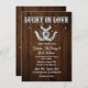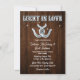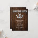 Bonito Convite Russo para Casamento com Ferraduras espumantes, uma fonte ocidental que diz "Lucky in Love" contra um fundo de madeira de celeiro. Excelente para um casamento em rancho, celeiro, ocidental, ao ar livre ou rústico. Ilustração desenhada à mão por McBooboo.