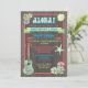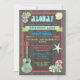 Convocações Rustic Luau Tropical Beach. Bonito convite de Luau no aniversário com lindas cores suaves e um fundo de madeira escura e escura. Possui flores de hibisco bonito, conchas, estrelas, bandeiras e um ukulele haiano colorido. Ilustração desenhada à mão por McBooboo.