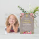 Meninas primeiro convite de comunhão sagrado com um fundo de madeira rústico, uma foto do seu filho, brilho de ouro espalhado, um bonito display floral cor-de-água rosa, um título de folha de ouro de guião, uma cruz religiosa e um modelo de comunhão sagrado que é fácil de personalizar.