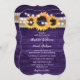 Rustic purple and sunflower wedding invitation featuring sunflowers and string lights against a rustic wood background adorned with burlap and lace ribbon. Two burlap hearts at the back. Easily personalize this purple floral wedding card with your wedding details.