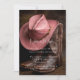 Uma imagem lindamente composta captando a essência de um casamento country, apresentando um par de botas castanhas bem detalhadas, em conjunto com um chapéu de cowboy de cor rosa. Colocada contra um pano de fundo robusto de couro; também uma textura de couro na parte de trás da carta, a cena evoca charme, tradição e elegância ocidental — perfeita para a noiva ou noivo moderno que está trazendo um pequeno talento rural para o seu grande dia.