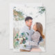 Este belo convite fotográfico de casamento contém elementos botânicos florais vibrantes colocados contra um fundo verde pastel bonito. Este convite chic inclui toques de caligrafia bonito.