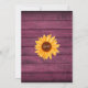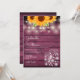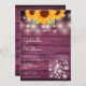 Um convite de casamento na moda rústico com flores de sol bonito, luzes de cordas e frascos-pedras. Os nomes dos casais felizes são colocados em um roteiro elegante acima dos detalhes especiais do casamento em um fundo de madeira vermelha rusticada. O reverso apresenta as iniciais do seu monograma num girassol correspondente. Projetado por Thisnotme©