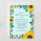 Primeiro convite da comunião russa com girassóis vibrantes, margaridas brancas tradicionais e flores lacrimogêneas contra um fundo aqua leve com sopro de bebê e sotaques botânicos verdes