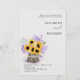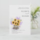 Um pote de flor, feito de latido de árvore e cheio de um buquê exuberante de girassóis e híbridos, trigo e hálito de bebê, faz uma bela ilustração, pintada à mão em aquarela digital, que decora este convite de casamento elegante e rústico. Romântico e charmoso, é uma escolha encantadora para um casamento de celeiro, um casamento ao ar livre, um casamento de jardim ou qualquer lugar rústico.