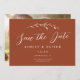 Este elegante casamento salva a data mostra um belo fundo de terracota, um girino de flor silvestre desenhado à mão, e uma tipografia elegante. Na parte de trás está sua foto em formato horizontal. A foto no verso é removível, se desejado. É uma design perfeita para um casamento rústico, mas elegante! Veja a coleção para mais itens!