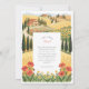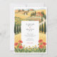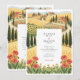 Transport your guests to the sun-drenched hills of Italy with this breathtaking wedding invitation suite. The design features a stunning, hand-painted illustration of a pastoral Tuscan landscape, perfect for a destination wedding or a rustic vineyard celebration. The artwork showcases rolling fields of golden wheat and vibrant yellow sunflower fields stretching toward the horizon, punctuated by iconic, tall dark green cypress trees. In the foreground, a charming meadow of bright red poppies and delicate small yellow wildflowers frames the event details, adding a splash of romantic color.