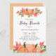 Convide convidados para o seu chá de fraldas com este convite para o bebê do outono, personalizável. Apresenta abóboras laranja-aquarela, folhas de maple e verde. Personalize este convite para o brunch de bebê em aquarela adicionando seus detalhes de evento. Este convite para bebê de abóbora é perfeito para chás de fraldas de outono.