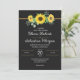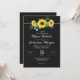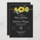 Design apresenta um buquê de girassóis amarelados, eucalipto e outras folhas e galhos sobre fundo preto