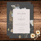Anuncie seu casamento com um toque de elegância rústica. Nosso convite de casamento cativante apresenta um arranjo vibrante de flores silvestres e samambaias, meticulosamente desenhados à mão e lembrando tesouros botânicos pressionados. Cores ricas como bronzeado, amarelo, creme, azul e verde-sábio se destacam lindamente sobre um quadro de fundo preto de carvão suave. Os detalhes do seu casamento são mostrados em uma caixa de texto de creme nítida, garantindo clareza e elegância. Este design captivador captura a essência de um campo de flores silvestres, oferecendo uma maneira única e memorável de celebrar sua história de amor. Criado pela imprensa simplesmente de farmácia.