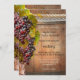 Convite de casamento com um barril de vinho rústico, vinha e uvas com corda e rendas. Este convite tem um cartão RSVP e faz parte de uma coleção.
