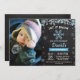 Convite de aniversário Rustic Winter Snowflake Blue and Silver Boy com fotografia personalizada. Aniversário. Floco de neve brilhante azul e prateado. Feriado de Natal de inverno. Fundo Chalkboard. Preto & Branco. segundo 1rua 5 3 4º 6 7 8º 9º 9º 11 10º 12 de 13 14 15, qualquer idade. Para mais personalização, clique no botão "Personalizar" e use nossa ferramenta de design para modificar este modelo.