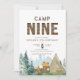 Este divertido convite rústico tem uma madeira chamada "NINE" divertida texto decorativo. O fundo tem uma floresta aquosa, montanhas e paisagem. É finalizado pelos elementos de acampamento bronzeado, verde e castanho, que incluem uma tenda e uma lareira. O dorso tem um padrão da mesma tenda de aquarela.