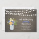 Celebre seu dia especial com este convite de na moda. Este design apresenta luzes de cordas, jarro de pedras e buquê de flores com um fundo de madeira rústico. Você pode personalizar o texto para qualquer idade ou eventos.