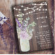 Convite de casamento russo, com arte original de florais, rosas, lavandas e eucalipto maravilhosos, arranjados em um pedreiro vintage. Tudo organizado em um fundo de efeito arborizado com luzes cintilantes. Personalize-se com facilidade para criar o convite de casamento rústico perfeito.