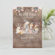 Animais de floresta cortês selvagens, um chá de fraldas neutro Convite lançado sobre um fundo de madeira marrom rústica com um dorso de coordenação.