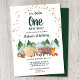 Convite de festas rupto de primeiro aniversario, com ilustração de animais da floresta com sua tenda acampando nas montanhas e na floresta, uma camada de estrelas de ouro e "Foi um Ano Selvagem" em um roteiro verde de caçador negro.