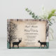 Convites russos para casamentos de madeira desenhados com silhuetas de um veado de galho com galhadas, uma pomba, e duas árvores de inverno sobre um fundo marrom de madeira e um design verde caçador desbotado no fundo. Os detalhes do seu casamento são impressos por costume em uma ilustração de papel rústico.