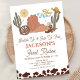 Rustic Brown Yee-haw Cowboy First Rodeo primeiro aniversario Convite Moderno em estilo cowboy, oeste ou oeste — o primeiro convite de aniversário para o bebê com um título retrô, cena oeste selvagem e padrão de impressão de vaca. Este primeiro convite para primeiros aniversarios de rodeio é ideal para o primeiro aniversário de meninos de temas ocidentais.