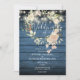Apresentando uma delicada cor d'água, terra floral e luzes bonito de cordas em um fundo azul rústico de madeira, este convite de casamento chic pode ser personalizado com sua informação especial sobre o dia do casamento. O reverso apresenta uma granja floral correspondente que enquadra suas iniciais de monograma em texto branco elegante em um fundo de madeira rústica. Projetado por Thisnotme©