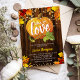 Um chá de panela de queda rústico perfeito para comemorações do outono. Apresentando um fundo de madeira escuro, uma abóbora reluzente com brilhos e o doce ditado "Cair no Amor", falso confetti dourado e luzes de fada reluzentes para adicionar romance e brilho, folhas coloridas em laranja, amarelo e marrom criando uma confortável vibração do outono e um modelo chá de panela que é fácil de personalizar.