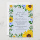 Convite russo para chás de fraldas com girassóis vibrantes, margaridas brancas tradicionais e flores azuis coloridas contra um fundo azul leve e poeirento com sopro de bebê e acentos botânicos verdes