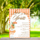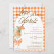 Rústico Elegante Amor Chico No Primeiro Chá de panela Spritz - Apresentando uma espiral de Aperol com uma fatia de laranja, enfeitiçada com um arco de laranja coquete. O convite tem um fundo laranja xadrez rústico, gingham e um quadro de arco. As palavras "Love at first Spritz" são escritas numa mistura de caligrafia refinada e texto marrom elegante para blocos. Edite este modelo de chá de panela com seus próprios detalhes de evento. Também disponível como download digital instantâneo, envio fácil via texto, email ou mídia social.