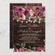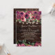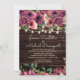 Convite de casamento com um fundo de madeira castanho-escuro rústico e luzes de cordas cintilantes com cor d'água rosa e roxa floral