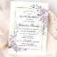 Rosas púrpuros e flores lilás roxas suaves misturam-se com freesia branca. Estão aninhados num arranjo botânico verde moderno, aberto e arejado. As flores roxas e brancas rodeiam uma elegante armação de ouro. Um modelo fácil de usar permite criar um convite incrível fácil e rápido.