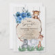 Uma fatia de madeira rústica com um spray floral azul no canto do convite para o bebê. Há animais da selva sentados na grama no fundo da fatia de madeira. Perfeito para o bebê a caminho. Personalize facilmente com as informações da sua festa.