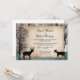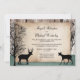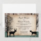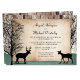 Convites apenas para recepção de casamento rústico florestal com cervos, exclusivamente projetados pela Artistically Invited, com silhuetas de um cervo macho com chifres, uma cerva e árvores de inverno sobre um fundo de madeira e um desenho verde caçador desbotado na parte inferior. Os detalhes da sua união e recepção são impressos personalizados sobre uma ilustração de papel rústico rasgado. Estes convites apenas para recepção de cervos são perfeitos para as celebrações da recepção pós-casamento com tema florestal ou de cervos.