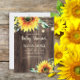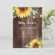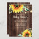 Convite à apresentação de chá de fraldas neutro, em termos de gênero, em forma de país, com madeira castanha rústica e castanha-escura, girassóis amarelos com verde e lamparinas e lanternas espumantes