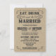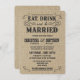 Convites ocidentais rústicos do casamento de serapilheira do estilo do vintage -- Coma, beba, e é casado -- Swirly, rolos encaracolado e tipografia ocidental velha do estilo da velho-forma no fundo tan natural sujo de serapilheira. Adicione os nomes dos noivos e a informação wedding neste modelo fácil de usar. Elegante mas divertimento e rotulação romântica, retro do estilo do poster do bar pode ser alterado para seu tema formal ou semi-formal do casamento. O estilo moderno ocasional é perfeito para casamentos contemporâneos na moda chiques com um toque do divertimento do encanto ocidental sul do vaqueiro para casais tradicionais. Contacte-nos por favor para a ajuda com personalização se você precisa a sala adicional para seus detalhes do casamento. Outros tamanhos e estilos disponíveis, junto com o porte postal de coordenação, acessórios nupciais, favores do chá, e fundamentos wedding do jogo para noivas diy em um orçamento. NOTA: Mostrado (4,5 x 6,25) em pequenos cartões pequenos do convite do tamanho.