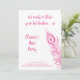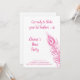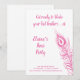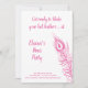 Uma grande pena de pavão em rosa decora este Convite de Festa de Galinhas em um fundo branco com o charmoso ditado, Prepare-se para Sacudir as Penas da Cauda! tornando-o perfeito para uma noite na cidade dançando para celebrar a noiva.