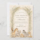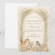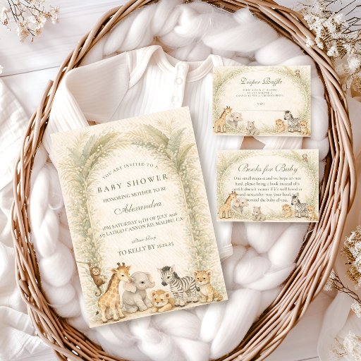 Soft watercolor safari friends gather beneath delicate jungle foliage in this charming neutral baby shower design. A sweet giraffe, elephant, zebra, lion, and tiny companions sit together on a warm parchment background framed by airy greenery and subtle botanical textures. The muted beige, sage, and soft earth tones create a calm, gender-neutral aesthetic that feels both elegant and playful. Perfect for a safari theme, jungle celebration, or modern woodland-inspired gathering.