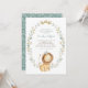 Um convite personalizável para o tema do chá de fraldas de leão, com ilustrações de aquarela de folhagem e estrelas, padrão de folhagem e um príncipe de leão bebê. Este convite de aspersão de bebê é perfeito para aspersão de chá de fraldas safari.