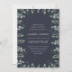 Pintado com cor d'água... armações verdes para seus detalhes de casamento na nossa coleção de casamento do Winter Sage. Elegante design apresenta um rico fundo azul marinho com folhagem botânica verde-clara e gelada e cartazes brancos.